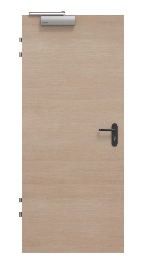 Do skonfigurowanych drzwi przeciwpożarowych należą między innymi zamykacz górny oraz zawiasy. Jeśli potrzebujesz certyfikatu, wymagana jest odpowiednia ościeżnica przeciwpożarowa.