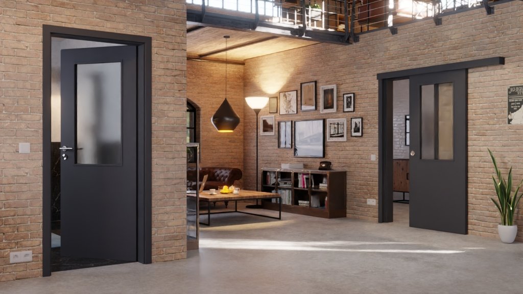 Wygodne rozwiązanie oszczędzające miejsce: Drzwi przesuwne 4.2 z powierzchnią CPL w kolorze grafitowym podobnym do RAL 7024 firmy Classen zapewniają większą swobodę ruchu w pomieszczeniach.