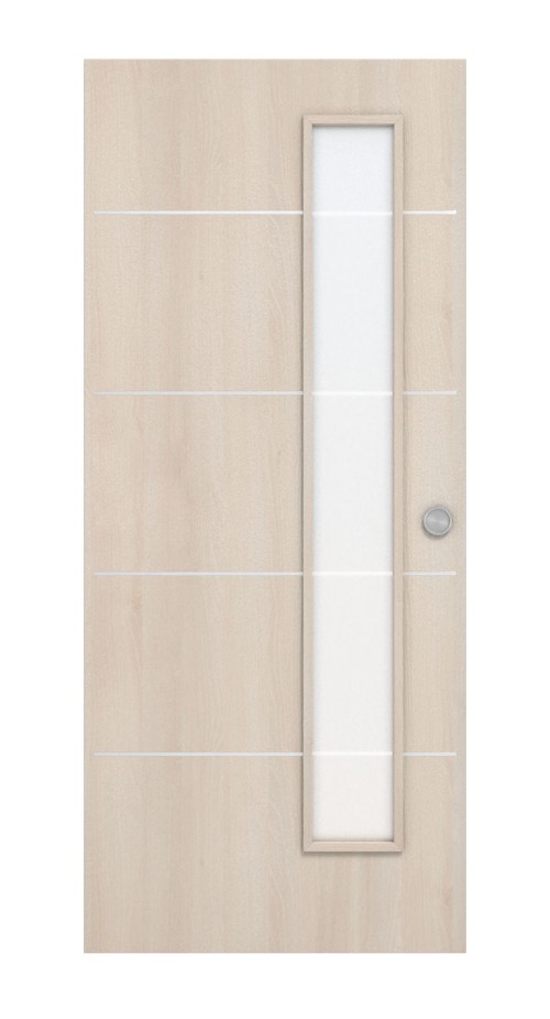 Połączenie jasnego dekoru akacjowego oraz otworu na światło po stronie zamka nadaje meblom nowoczesny wygląd. Do tego dochodzą cztery pasy, które biegną poziomo zarówno na samym skrzydle drzwi, jak i na szybie.