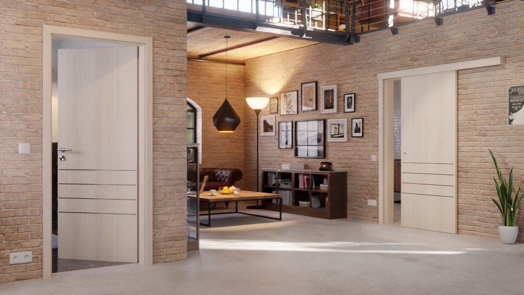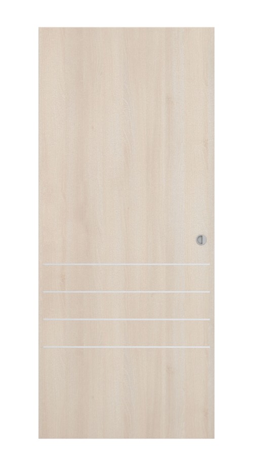 Dekor w kolorze akacja jasny nadaje pomieszczeniu przyjazny charakter. Całościowy wygląd ożywiają cztery listwy , które biegną poziomo w dolnej części skrzydła drzwiowego.