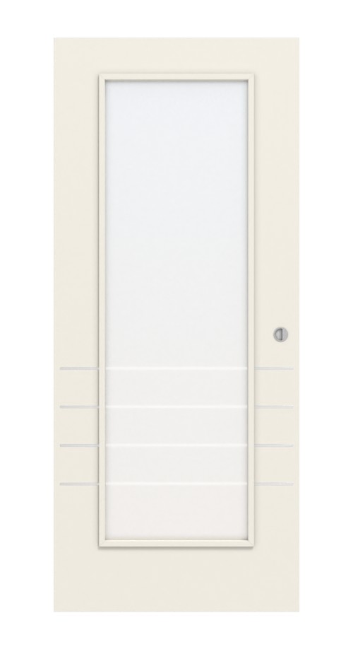 Biała powierzchnia nadaje drzwiom nowoczesny wygląd, który jest dodatkowo podkreślony przez szerokie przeszklenie. Elementem łączącym są cztery wzdłużne paski w dolnej części skrzydła drzwiowego.
