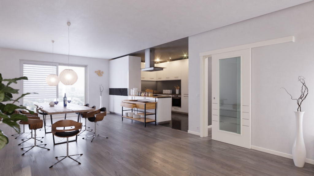 Oszczędność miejsca i wygoda: Drzwi przesuwne 4.10 z powierzchnią CPL w kolorze RAL 9010 firmy Classen zapewniają dużo wolnej przestrzeni i elegancki wystrój wnętrza.