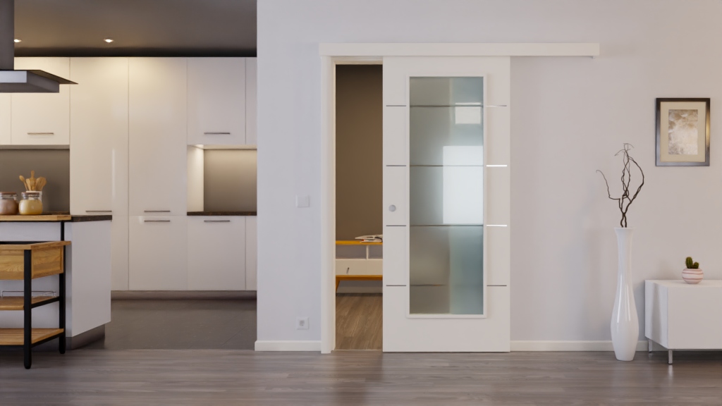 Model drzwi przesuwnych odpornych na codzienne użytkowanie w RAL 9010 z solidną konstrukcją: