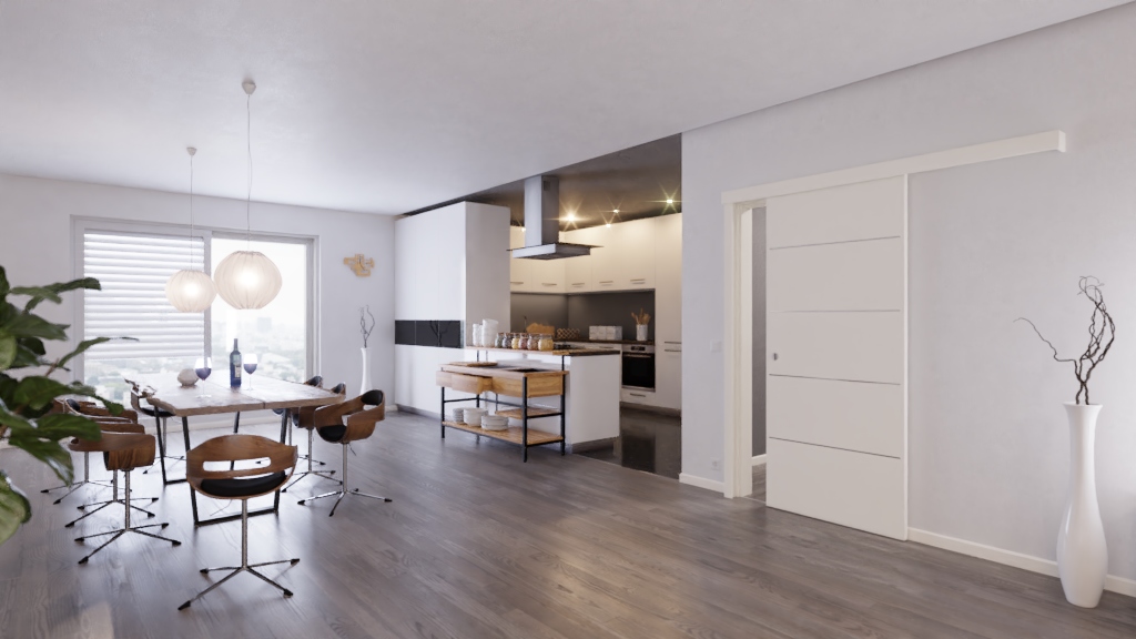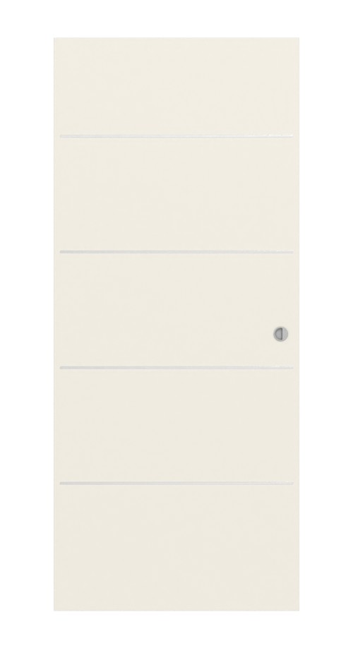 Praktyczne drzwi przesuwne w RAL 9010 z płytą wiórową, uchwytem i rowkiem podłogowym:
