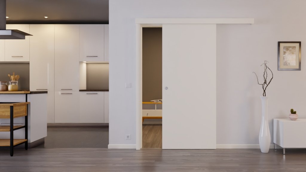 Codzienny model drzwi przesuwnych w RAL 9010, w tym rowek podłogowy i muszla uchwytowa: