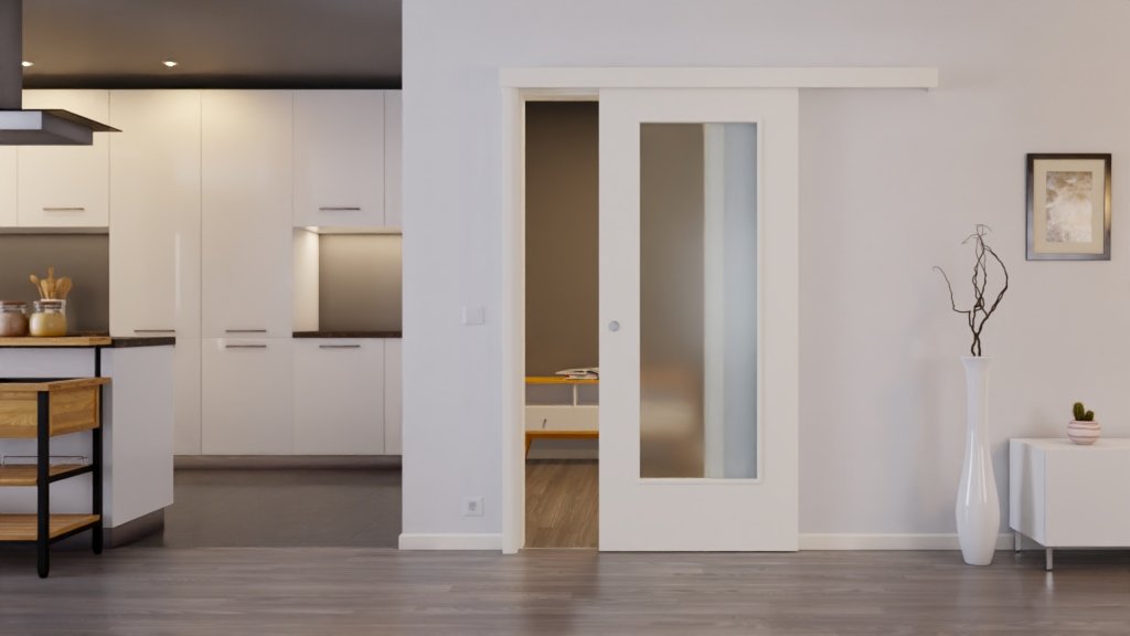 Stabilne drzwi przesuwne w RAL 9010 z uchwytem i rowkiem podłogowym: