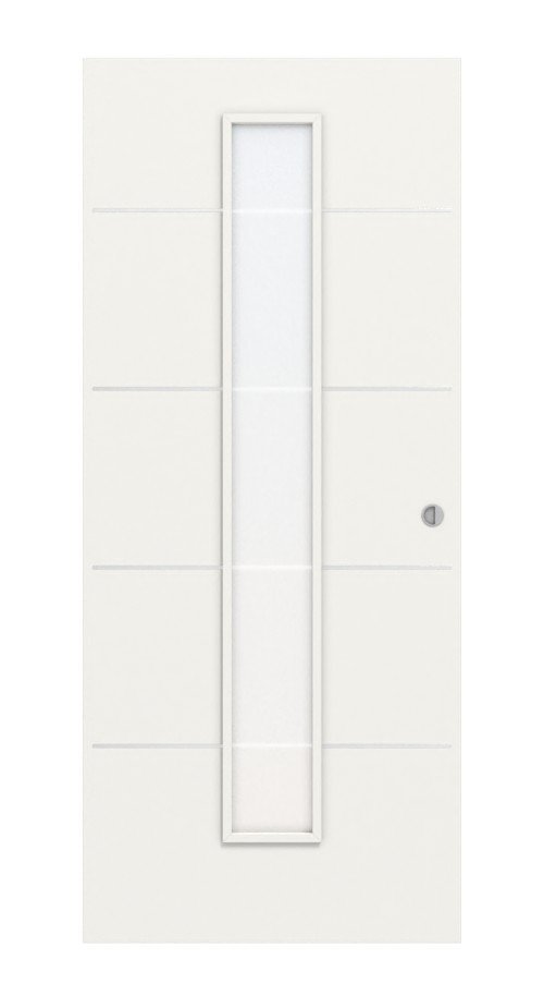W drzwiach zintegrowano wąski otwór świetlny w środku, dzięki czemu do pomieszczenia wpada trochę światła. Dodatkowo znajdują się cztery pasy, które rozciągają się zarówno na białej powierzchni, jak i na przeszkleniu w poziomie.