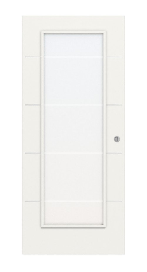 Te drzwi dzięki swojej białej powierzchni doskonale wpasowują się w niemal każdy styl wnętrza. Duże, centralne przeszklenie zapewnia jasne pomieszczenia. Na skrzydle drzwi znajdują się również cztery paski.