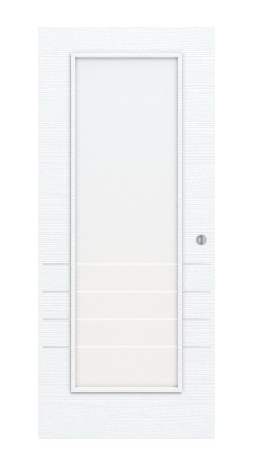 W centrum uwagi drzwi znajduje się duża powierzchnia szklenia, która zapewnia doskonałe doświetlenie pomieszczenia. Zaleta: Niezbędne szklenie jest już wliczone w cenę. Ponadto w dolnej części skrzydła drzwiowego znajdują się cztery paski. Warstwa wierzchnia jest strukturyzowana.
