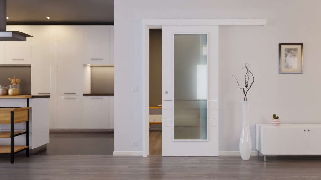 Stabilne drzwi przesuwne w białej strukturze z uchwytem i rowkiem podłogowym: