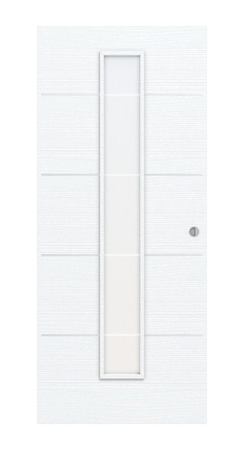Drzwi składają się z trzech elementów: Biała, strukturyzowana powierzchnia nadaje żywiołowości. W środkowej części zastosowano również wąskie przeszklenie, które dyskretnie przepuszcza światło. Dodatkowo cztery pasy biegną poziomo po skrzydle drzwiowym.