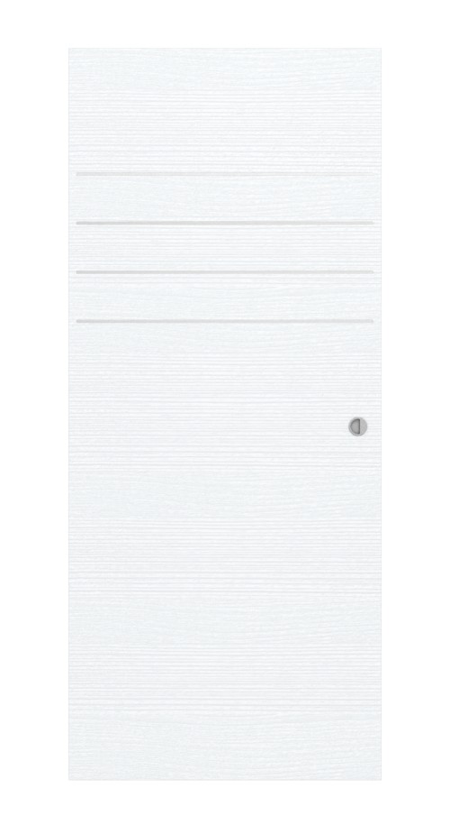 Oprócz skrzydła drzwi przesuwnych w zestawie znajduje się również listwa przypodłogowa i uchwyt wpuszczany muszlowy. Powłoka CPL, odpowiednia do codziennego użytku, wyróżnia się odpornością na zarysowania i uderzenia. Dzięki odporności na rozpuszczalniki i ścieranie drzwi można łatwo czyścić.