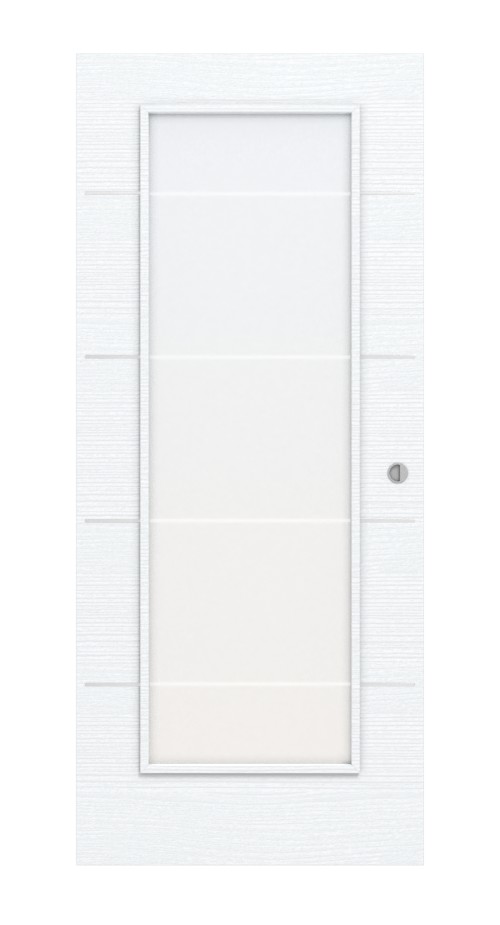 Większa część drzwi składa się z wycięcia na szybę, które zapewnia ogromny dopływ światła. Drobne, wzdłużne linie na białej powierzchni tworzą indywidualny wzór drzwi. Ponadto w skrzydle zintegrowane sącztery pasy, które rozciągają na powierzchni drzwi i przeszklenia.