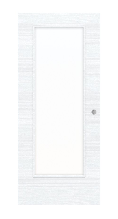 Indywidualny design drzwi powstaje dzięki drobnym, poziomym liniom na białym skrzydle drzwi przesuwnych. W przypadku dużego przeszklenia możesz wybrać między przezroczystym szkłem standardowym a opcją satynowaną.