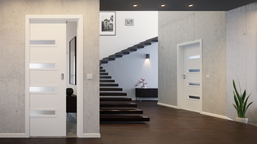 Nowe możliwości aranżacyjne: Ponadczasowy design w białym lakierze premium oferuje drzwi przesuwne w białym lakierze RAL 9016.