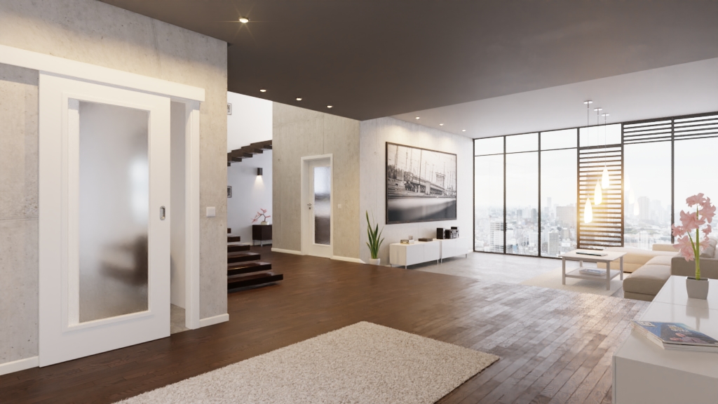 Wygląd płaskiego skrzydła drzwiowego określa duże przeszklenie. Otwór wydaje się niemal wypełniający. Wystające listwy szklane mogą być opcjonalnie wykonane na równi z powierzchnią. Różne rodzaje szkła są dostępne do aranżacji otworu. Czysty odcień w białym lakierze RAL 9016 jest nakładany w procesie wielowarstwowego lakierowania.