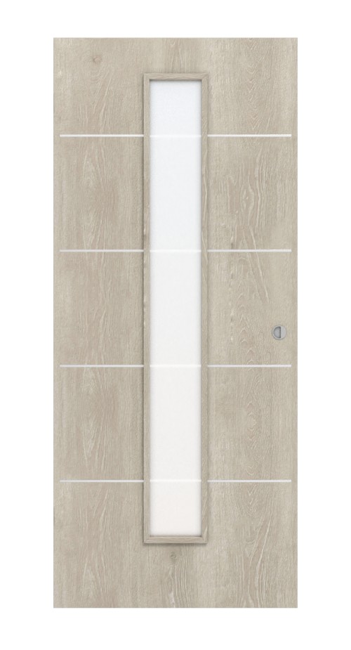 Skrzydło drzwi składa się z dwóch elementów. Po pierwsze, dzięki żywej powierzchni imitującej drewno stawiają Państwo na naturalny design. Z drugiej strony wyśrodkowany, wąski otwór świetlny wpuszcza do pomieszczenia odrobinę światła. Oba elementy są optycznie połączone za pomocą czterech pasków.