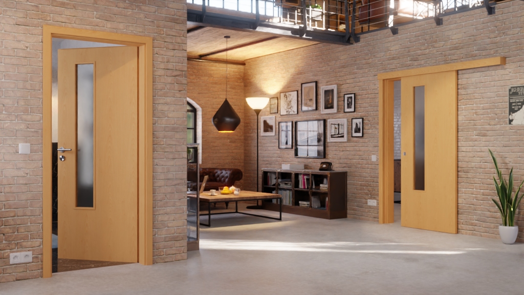 Po stronie zamka skrzydła drzwi przesuwnych znajduje się wąskie przeszklenie, które wpuszcza światło do pomieszczenia. Powierzchnia jest wykonana z drewna bukowego, które jest absolutnie ponadczasowe.