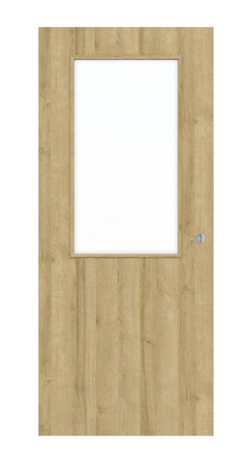 Dzięki powierzchni w kolorze Dąb Riviera masz gwarancję, że Twój dom zyska ciepły wygląd. Dodatkowo w górnej części skrzydła drzwiowego znajduje się centralne przeszklenie. Szkło zawarte jest zawarte w cenie produktu.