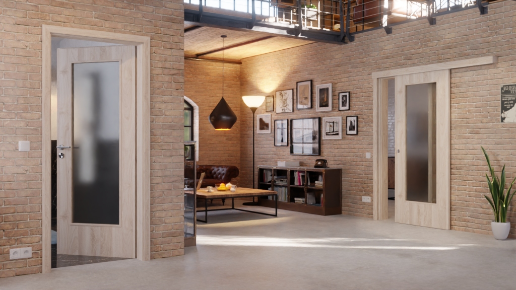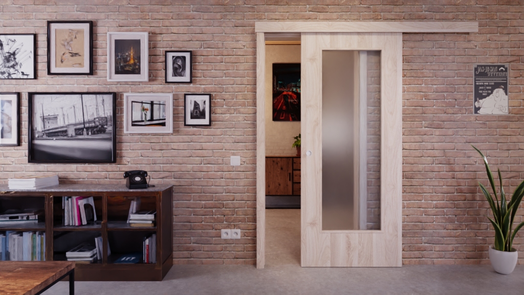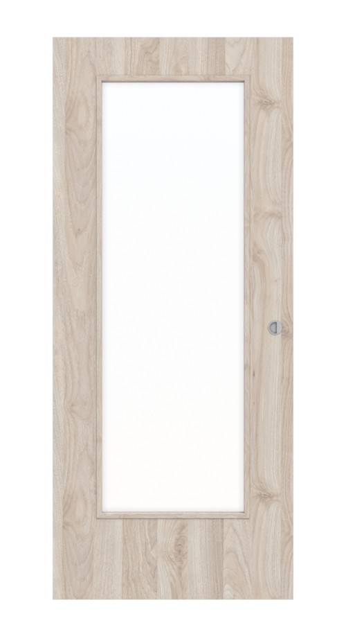 Drzwi mają na powierzchni folię dekoracyjną. Nadaje się idealnie do regularnego użytkowania. Oprócz skrzydła drzwi przesuwnych w zestawie znajduje się również prowadnica podłogowa oraz uchwyt muszlowy .