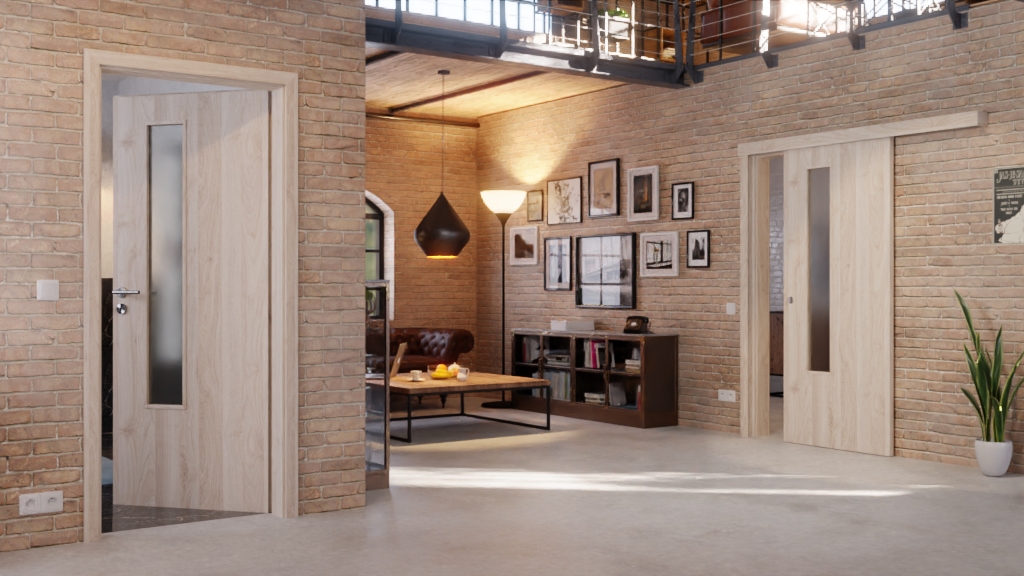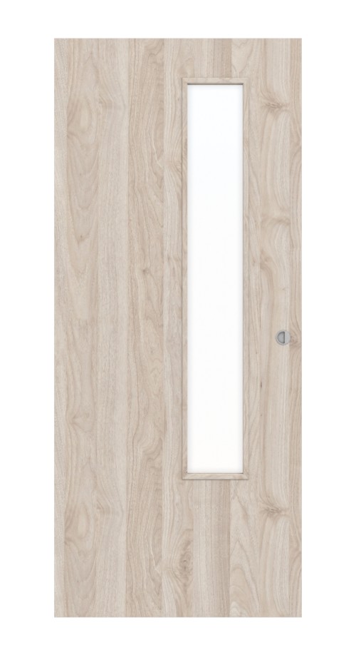 Po stronie zamka skrzydła drzwiowego zintegrowane jest subtelne przeszklenie. Wpuszcza ono trochę światła do pomieszczenia mieszkalnego. Powierzchnia jest wykończona w jasnym kolorze orzecha Columbia, który tworzy przyjazną i otwartą atmosferę.