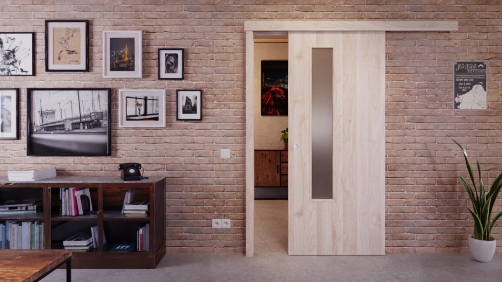 Model drzwi przesuwnych w designie drewnianym z uchwytem i rowkiem podłogowym: