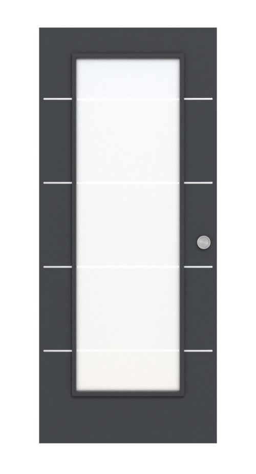W środkowej części drzwi znajduje się szerokie przeszklenie, które zapewnia dużą ilość światła w pomieszczeniu. Cztery poziome paski służą jako połączenie międzyskrzydłem drzwiowym a szkleniem.