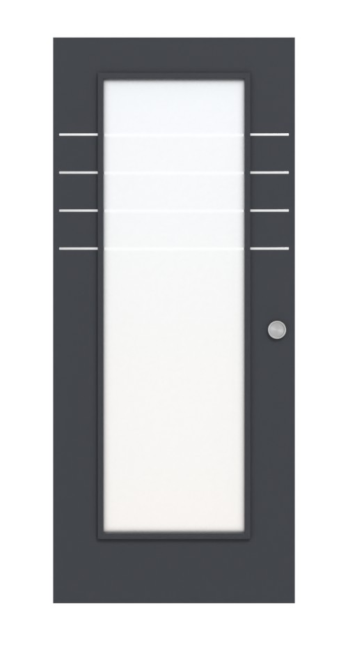 Ciemna powierzchnia jest nowoczesna i tworzy intrygującą atmosferę. W przypadku szkła ESG w przeszkleniu możesz wybierać między wykonaniem przezroczystym a satynowanym. Ponadto w górnej części skrzydła drzwiowego biegną poziomo cztery pasy .