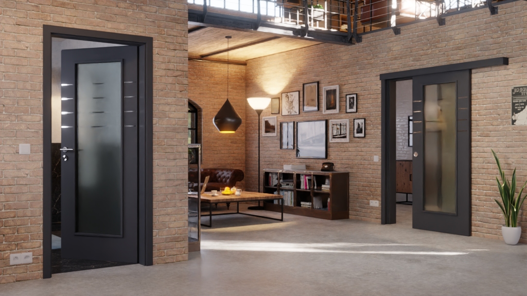 Praktyczne drzwi przesuwne w kolorze grafitowym podobnym do RAL 7024 z solidną konstrukcją: