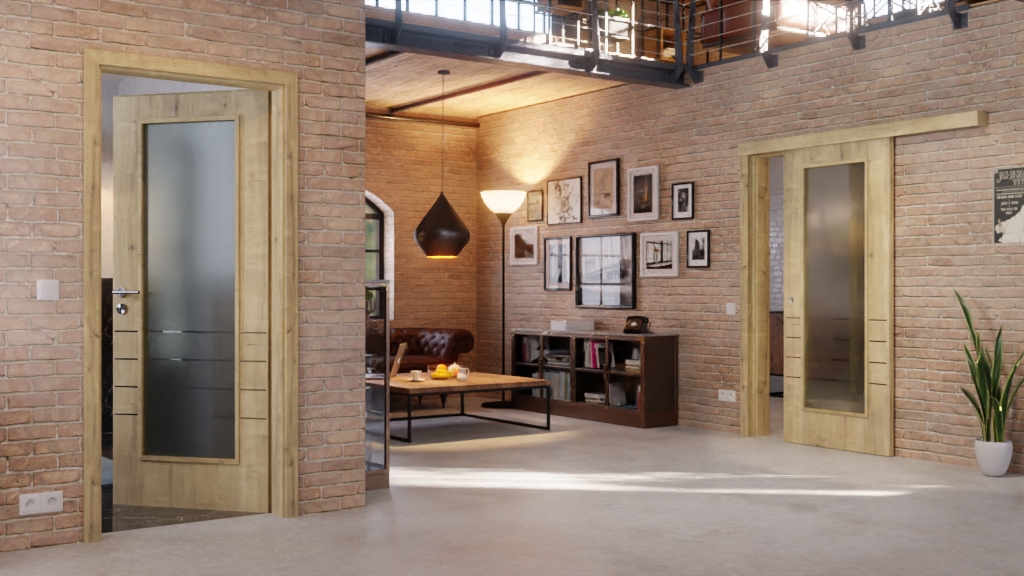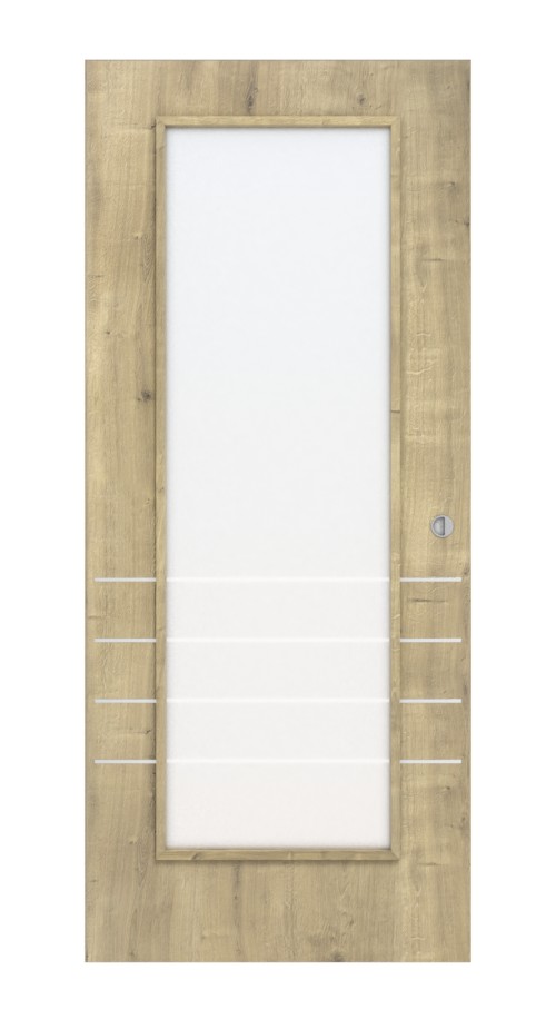 Naturalna dekoracja dębowa zachwyca rustykalnością. Dodatkowo, duże przeszklenie wpuszcza dużo światła do Twojego pomieszczenia. Całość dopełniają cztery paski w dolnej części skrzydła drzwi.