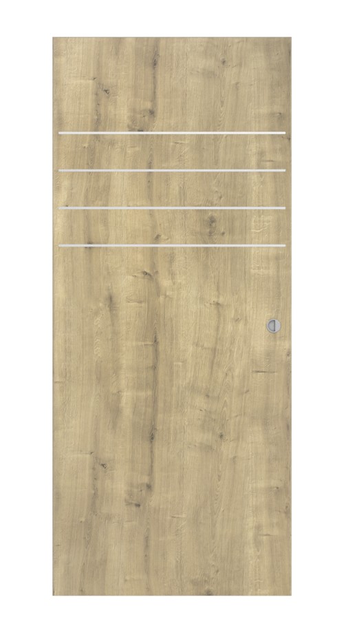 Dekor dębowy zachwyca naturalnością i rustykalnym stylem. Grube słoje i wtrącenia tworzą dynamiczny wygląd. Dodatkowo znajdują się cztery poziome listwy w górnej części skrzydła drzwi.