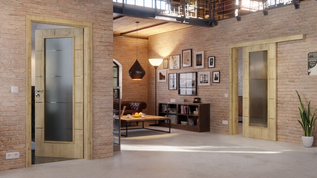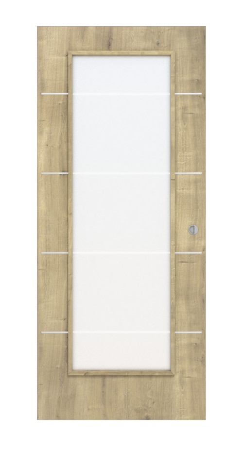 Ciepły dekor dębowy nadaje rustykalny wygląd, który jest ożywiony przez duży otwór świetlny. Przyczyniają się do tego również cztery paski, które równomiernie biegną poziomo przez skrzydło drzwi i przeszklenie.