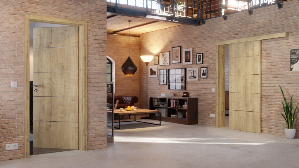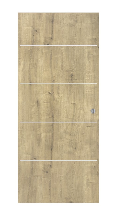 Rustykalny dekor dębowy emanuje ciepłą i znajomą atmosferą. O wyjątkowy charakter dbają cztery listwy, które równomiernie przebiegają poziomo przez skrzydło drzwi.