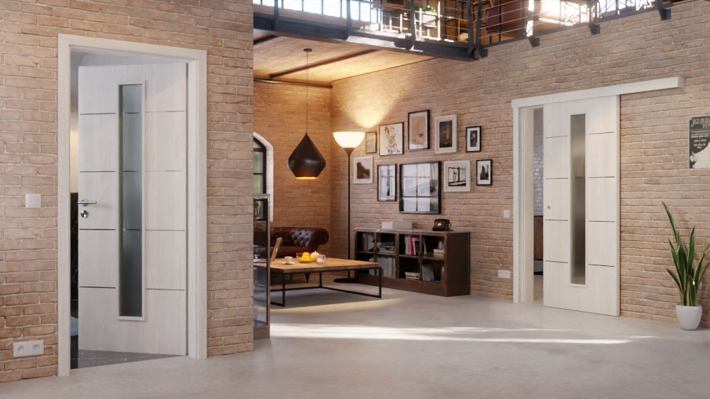 W każdym skrzydle drzwiowym pośrodku znajduje się wąskie wycięcie na szybę, które zapewnia dyskretną wymianę światła między pomieszczeniami. Dekor jesionowy jest jasny i dzięki temu wygląda harmonijnie. Oba elementy są optycznie połączone za pomocą czterech pasków .