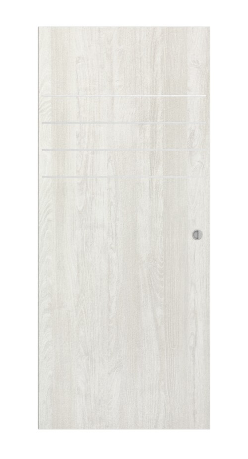 Jasny dekor z drewna jesionowego tworzy atmosferę otwartej przestrzeni mieszkalnej. Dodatkowo w górnej części skrzydła drzwiowego znajdują się cztery poziome pasy, które przyciągają wzrok.