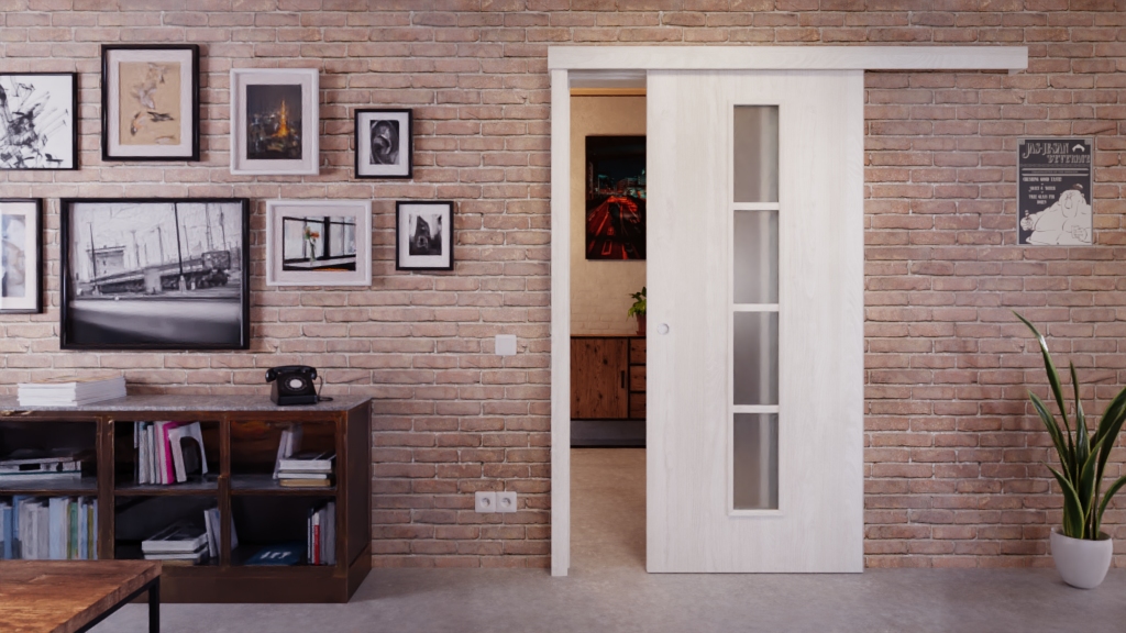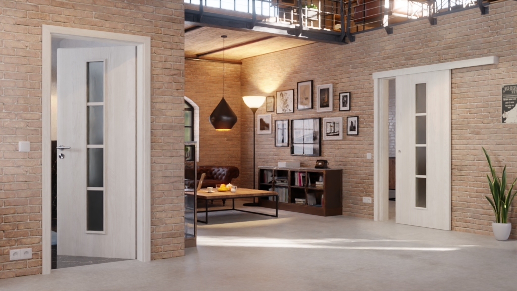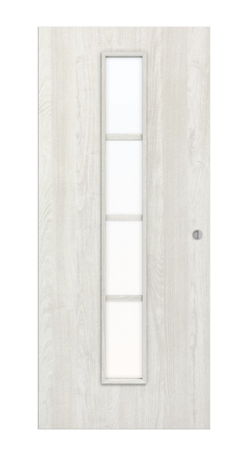 W środkowej części skrzydła drzwiowego znajduje się wąski, podzielony na cztery części otwór okienny . W przypadku szkła możesz wybierać między przezroczystym wyglądem a opcją satynową. Połączenie dekoru jesionowego i przeszkleń tworzy otwarty design.