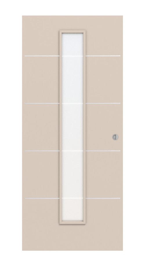 Na skrzydle drzwiowym znajduje się wąskie wycięcie na szybę, które zapewnia delikatną wymianę światła między pomieszczeniami. Beżowa powierzchnia emanuje ciepłem i dzięki temu wygląda harmonijnie. Oba elementy są optycznie połączone czterema paskami.