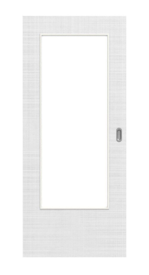 W jasnym skrzydle drzwiowym umieszczono dużą powierzchnię szklaną, która zapewnia dopływ światła do pomieszczeń . Dzięki wytłoczonej strukturze drobne linie naturalnego wzoru lnu są wyczuwalne w dotyku.