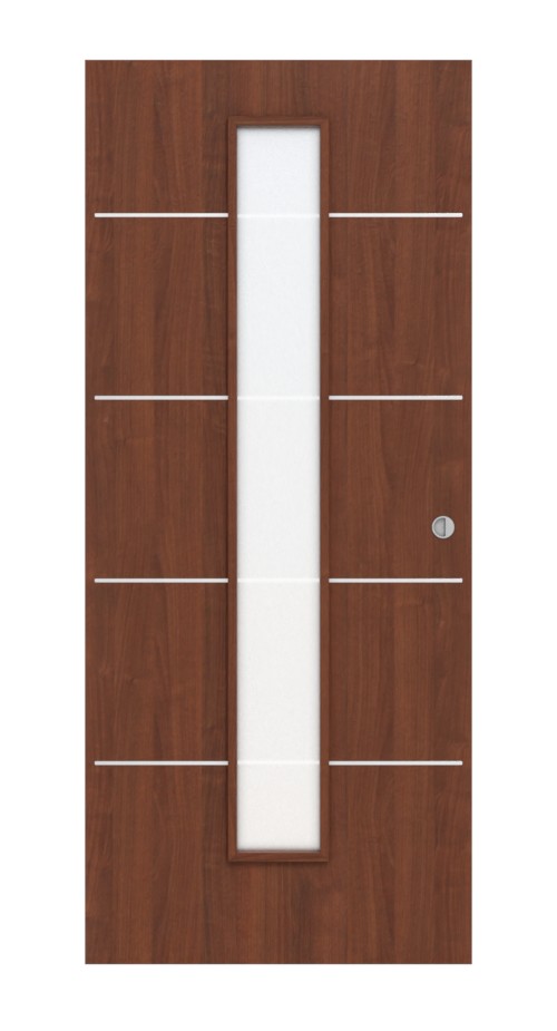 Na skrzydle drzwiowym znajduje się wąskie wycięcie na szybę, które zapewnia delikatną wymianę światła między pomieszczeniami. Wykończenie orzechowe jest ciepłe i dzięki temu sprawia wrażenie przytulnego. Oba elementy są optycznie połączone czterema paskami.