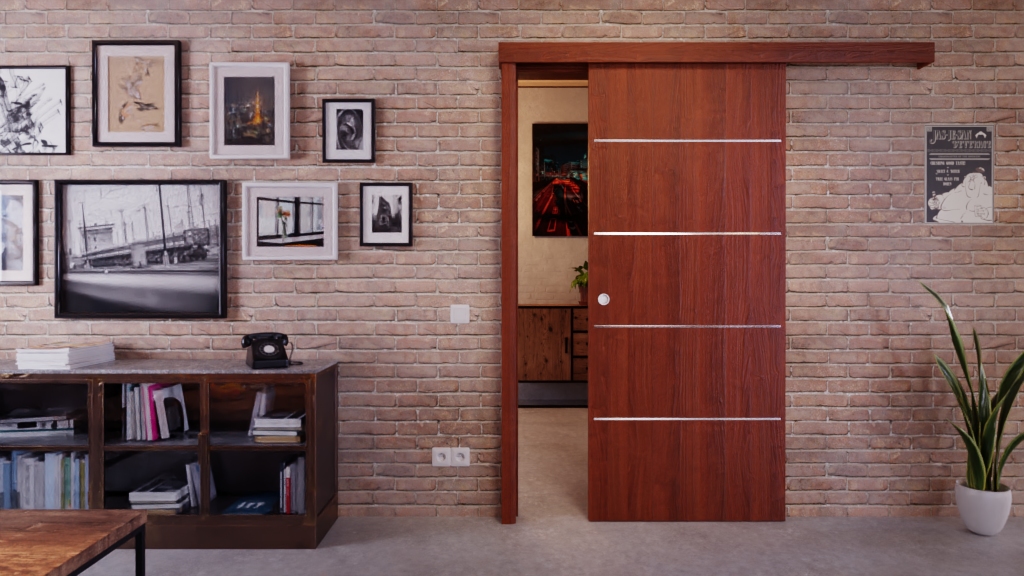 Stabilny model drzwi przesuwnych w orzechu włoskim z solidną płytą wiórową: