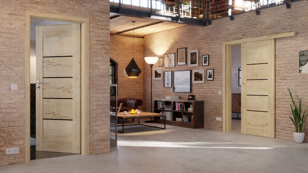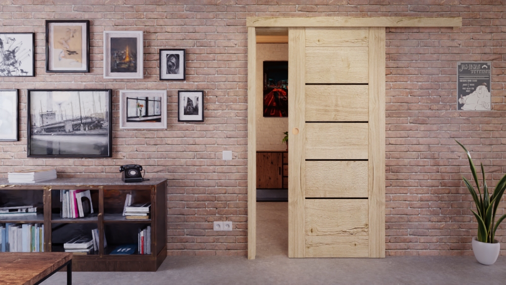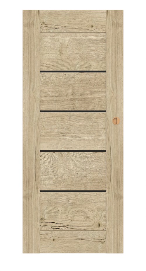 Wytrzymałe drzwi przesuwne z folią dekoracyjną w dekorze dębu: