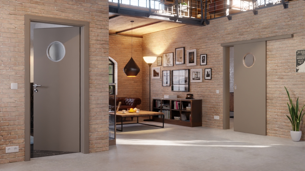 Za przestronność i jasność odpowiada okrągłe przeszklenie umieszczone w skrzydle drzwiowym.