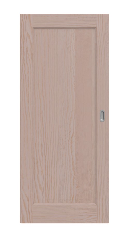 Szerokie, profilowane listwy otaczają wyodrębnioną wkładkę w środku skrzydła drzwi. Bezsękowy rysunek przebiega przez drewno sosnowe, nadając każdemu skrzydłu drzwi indywidualny charakter.