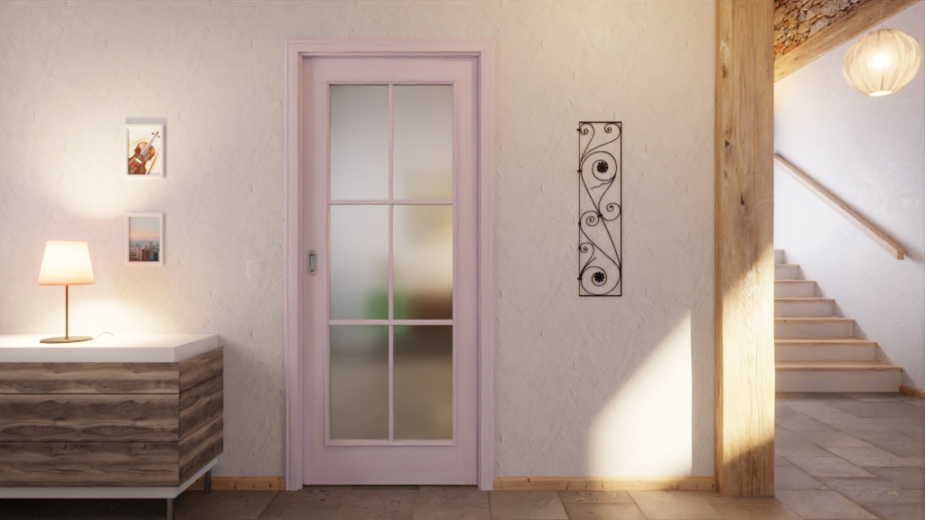 Elegancka rama z przegrodami ozdabia duże przeszklenie, które harmonijnie otacza stylowo zdobiona listwa szklana. Delikatnie rysują się bezsęczne słoje świerka pod białą pigmentacją, nadając każdemu skrzydłu drzwi indywidualny charakter.