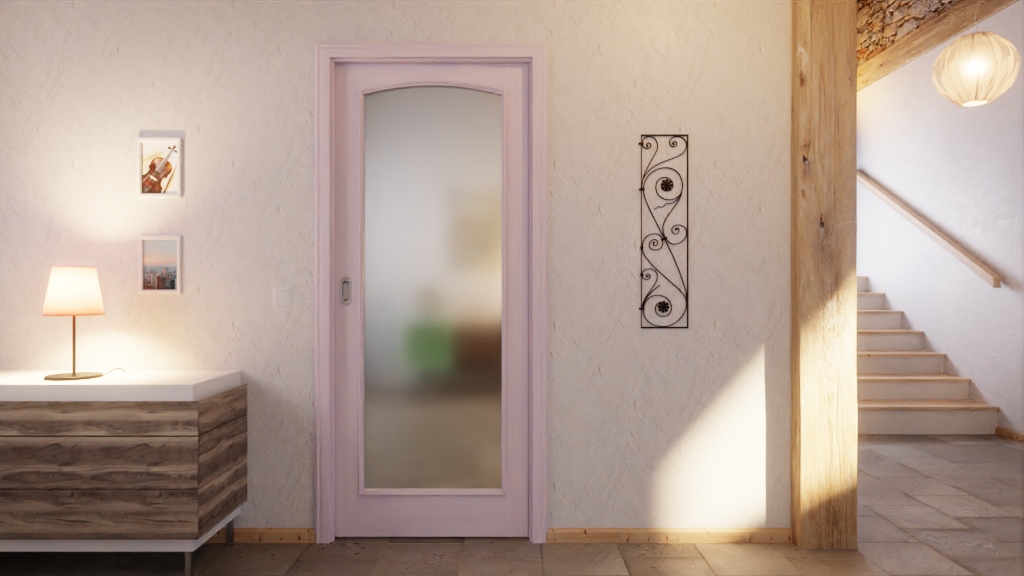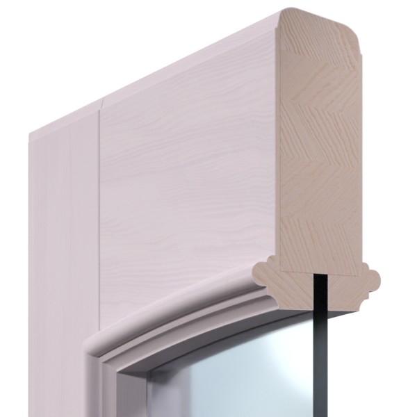Szerokie listwy i eleganckie ramki szklane otaczają duży otwór szklany, który na górze kończy się łukiem segmentowym. Dzięki białej pigmentacji świerkowe drewno bez sęków zyskuje przyjazny wygląd. Pod nim delikatnie rysują się naturalne słoje drewna, które czynią każde drzwi unikalnym dziełem sztuki.
