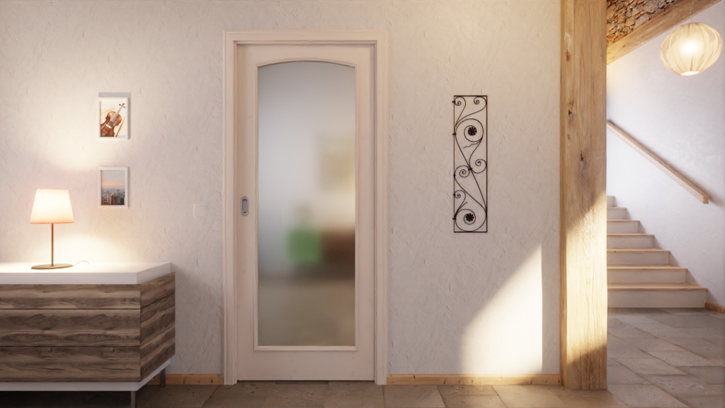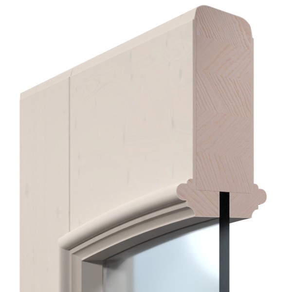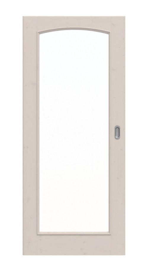 Duże przeszklenie z łukiem segmentowym wprowadza więcej światła do Twoich pomieszczeń. Szerokie listwy są elegancko podkreślone przez ozdobne listwy szklane. Pod białym pigmentem subtelnie rysuje się słojowanie świerku z gałęziami.