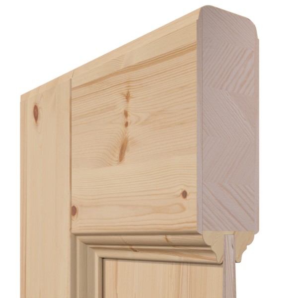 Dwie profilowane wypełnienia, otoczone ozdobnymi fryzami, tworzą elegancki wygląd z wyraźnymi konturami. Typowe słoje z sękami zdobią drewno sosnowe i nadają mu rustykalny charakter.