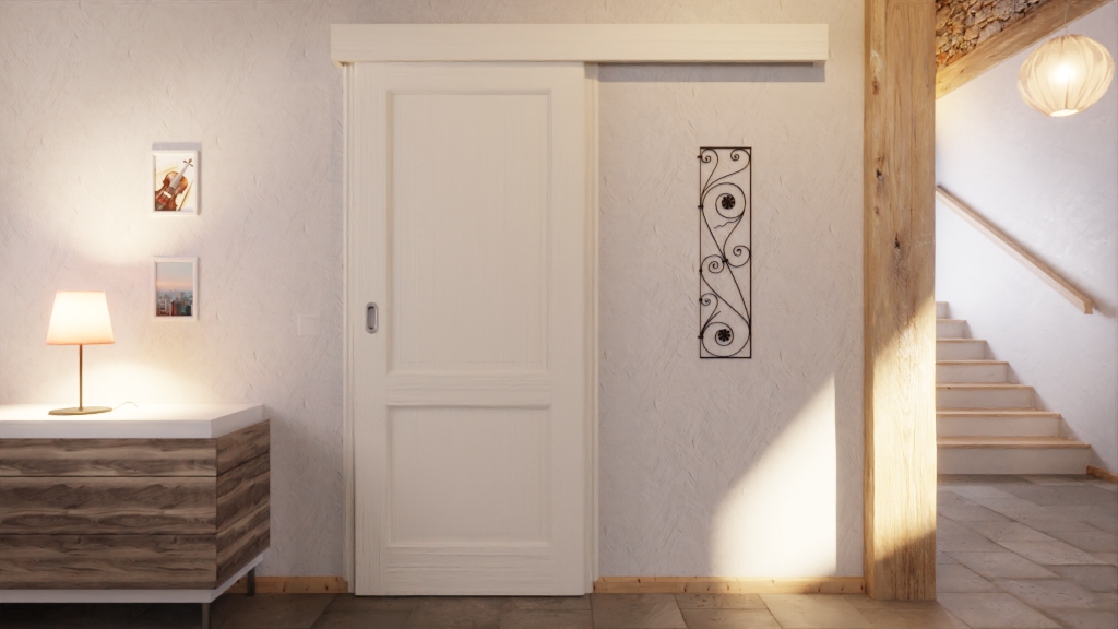 Stylowe drzwi przesuwne wewnętrzne z drewna litego o wysokiej stabilności dzięki konstrukcji warstwowo klejonej: