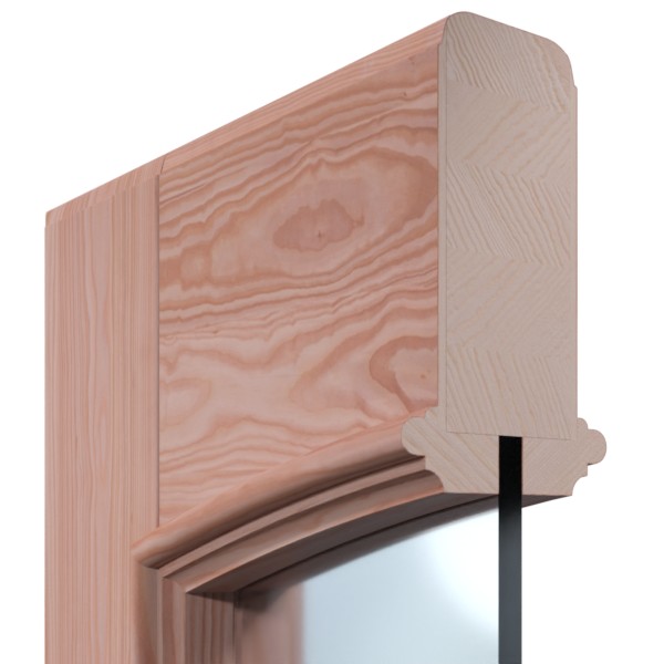Dzięki dużemu przeszkleniu z eleganckim łukiem segmentowym i ramą z przegrodami do pomieszczenia wpada przyjemne światło. Ozdobne listwy szklane i szerokie fryzy dopełniają klasyczny design. Na drewno modrzewiowe widoczne są naturalne słoje.
