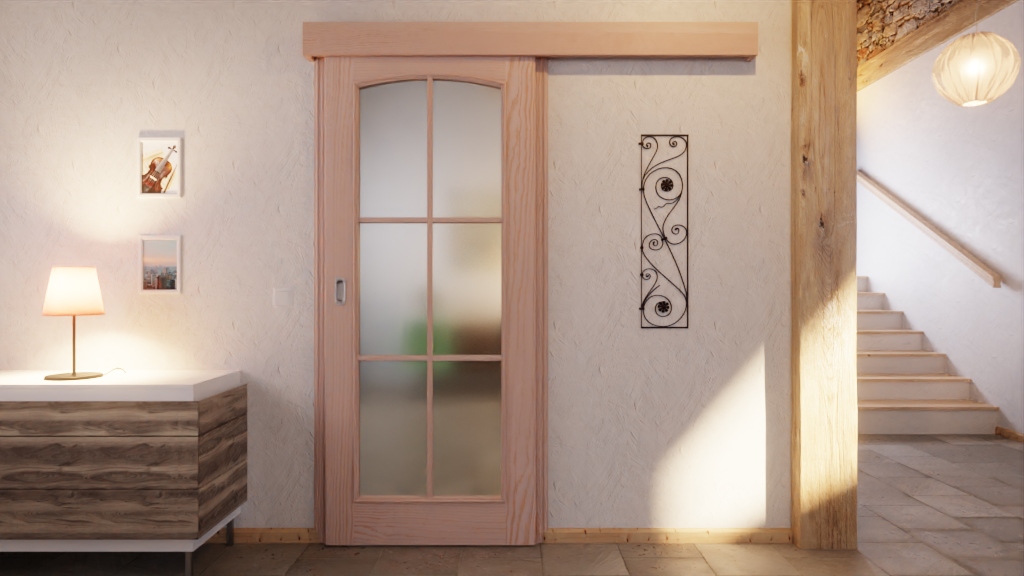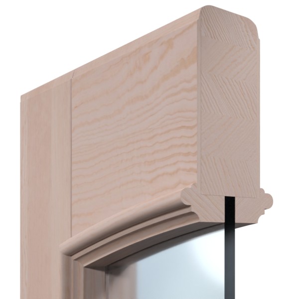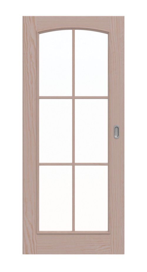 Dzięki dużemu przeszkleniu z eleganckim łukiem segmentowym i ramą z przegrodami do pomieszczenia wpada przyjemne światło. Ozdobne listwy szklane i szerokie fryzy dopełniają klasyczny design. Dzięki zawsze unikalnemu układowi słojów drewna sosnowego każde drzwi zyskują indywidualny charakter.